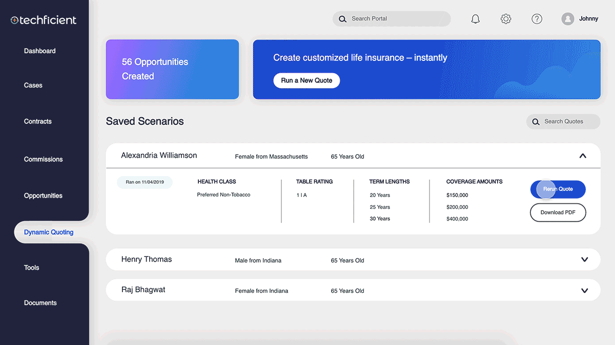 Additionally, their dashboard is a log of previous scenarios, keeps track of their progress, and allows agents to revisit past quotes.